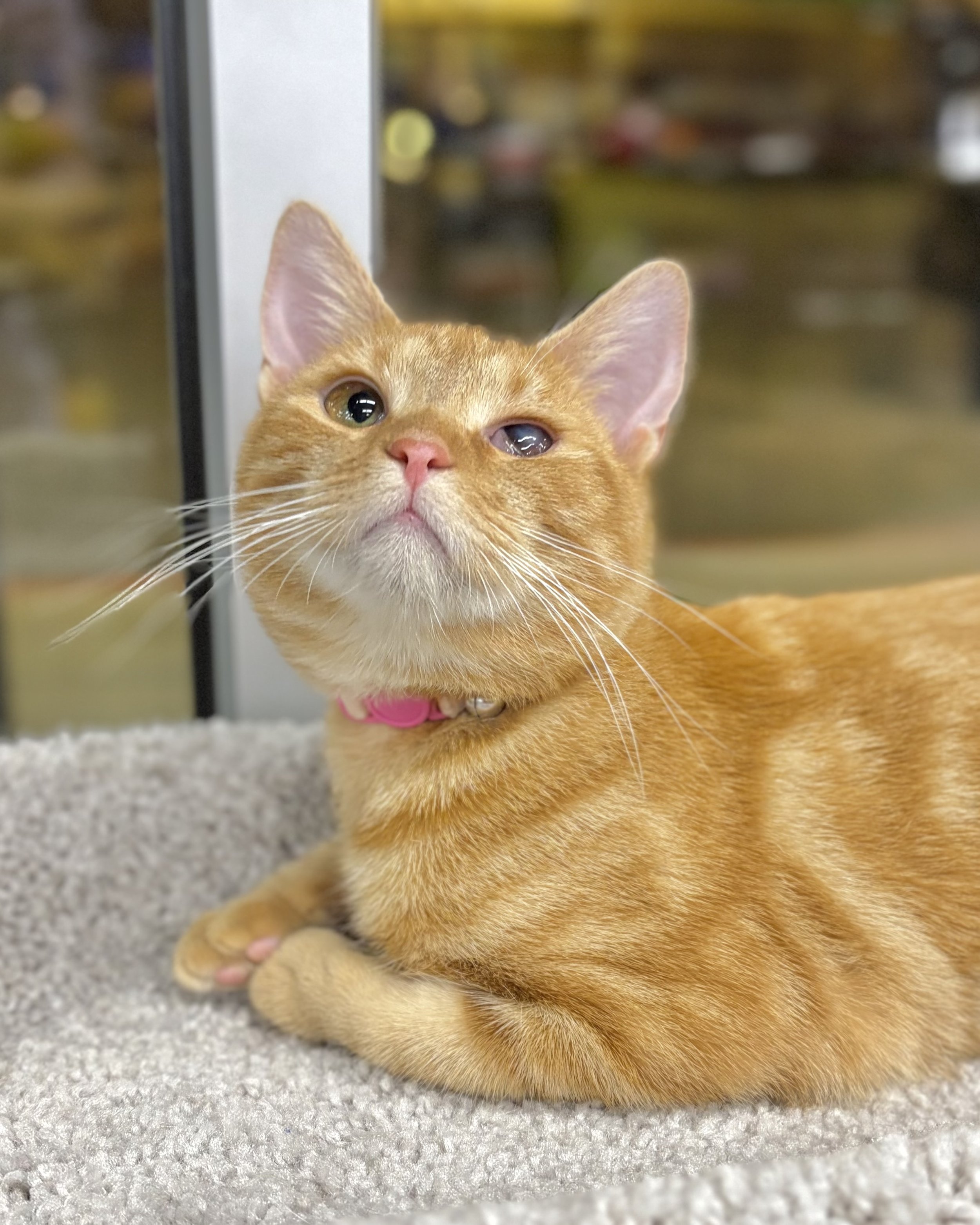As a young kitten, I experienced entropion in my right eye, which was quite painful. Thankfully, Furballs assisted me in getting entropion surgery, allowing me to live without pain in my eye. Although I may have partial blindness in that eye, my heart is full of gold and love to share.